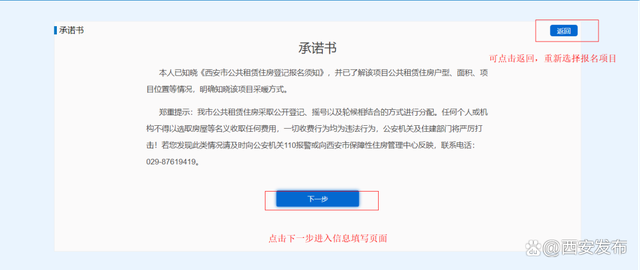 第七步:進(jìn)入承諾書頁面點(diǎn)擊【下一步】,或點(diǎn)擊【返回】,可重新選擇報(bào)名項(xiàng)目,如圖: