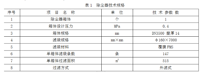 煤氣回收系統中的除塵器不僅具有過濾、凈化煤氣功能,同時還承擔著高壓煤氣緩沖罐的重要作用,可有效消除高壓煤氣對管網的沖擊,同時還影響煤氣回收速度,因此,除塵箱體容積不宜過小。泰鋼1780m3高爐平均放散時間約10s,煤氣平均流量80m3/次,放散次數約180次/天,每天放散煤氣流量約為3.1萬m3。為保證過濾后粉塵含量≤5mg/Nm3及除塵系統的長期穩定運行,除塵器應能夠承受0.06Mpa的差壓和0.4Mpa的最高壓力,過濾面積515m3,濾袋風速0.93m/min。