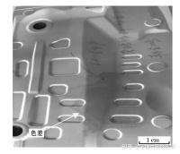 沖壓后色差缺陷出現在熱鍍鋅鋼板的沖壓件上,宏觀形貌如圖所示,呈現無規則片狀。