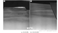 熱鍍鋅帶鋼表面砂盤打磨后色差缺陷宏觀形 貌如圖(a)所示,呈暗黑色圓形;無色差位置砂盤 打磨后宏觀形貌如圖(b)所示。