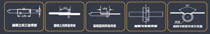問答題2:給出正確的扁鋼焊接搭接示意圖,扁鋼與扁鋼搭接至少幾面施焊?其他方式的搭接示意圖和焊接要求有哪些?