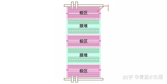 說完了電滲析的原理和交換膜的分離特性之后,我們再來看一下電滲析器的構成。電滲析器的主體包括膜堆、極區和緊固裝置: