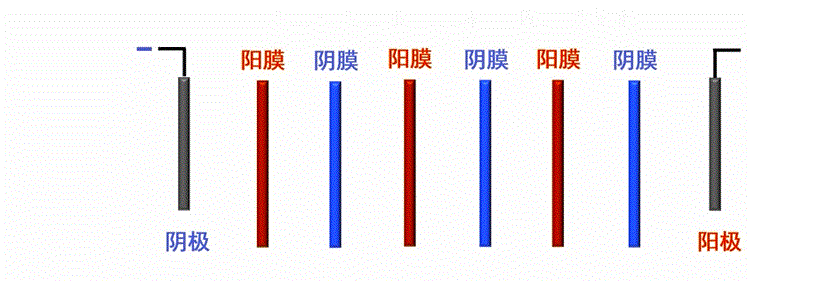 通過陽極和陰極在裝置兩側施加直流電場,陰、陽離子交換膜則交替排列在陽極和陰極之間,兩種膜之間用特制的隔板隔開,隔板內則有水流的通道。