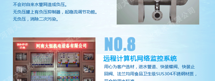 | 主營產品或服務 | 生產、加工、銷售、安裝于一體的不銹鋼水箱生產廠家,主營產品:不銹鋼水箱、鍍鋅水箱、二次加壓供水設備、無負壓供水設備、紫外線消毒器、熱交換設備、低壓配電柜、除鐵除氟設備、臭氧發生器、消防增壓穩壓設備、智能箱泵一體化設備、智能化水廠工程、遠程計算機網絡監控系統。 | ||