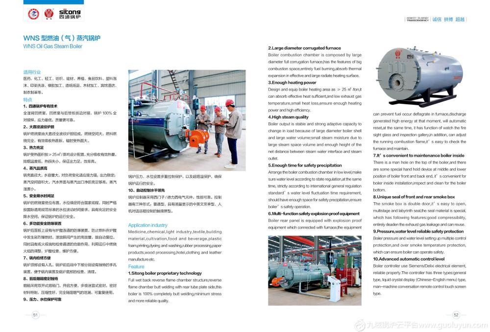 WNS series of automatic gas (oil) steam boiler with three return, wet back type structure, the combustion chamber is used in the corrugated furnace, and the low level layout, maximize the radiation heating surface, improve the boiler thermal efficiency.