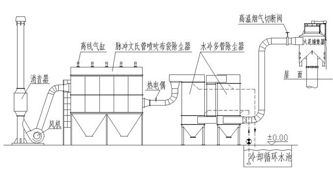 過濾:含塵煙氣經煙道進入進氣管,由上部進入進氣室,部分粗粒由慣性而落入灰斗,其余部分煙氣粉塵進入濾袋,經內表面過濾后,進入袋室,然后經由通風槽、排氣閥、出氣管道由排風機排入大氣,該設備為上部進氣,負壓操作內濾式玻纖袋除塵器。