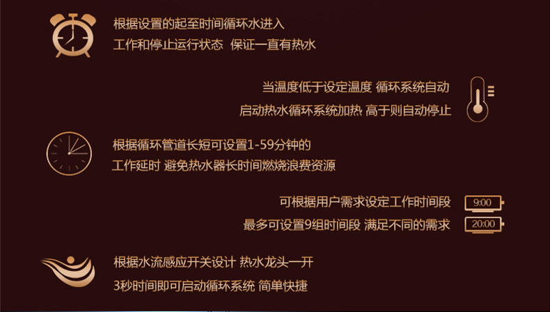 二、回水器適合哪些熱水器呢?當然主要是燃氣熱水器了,因為電熱水器本身就具有自動保溫的功能,而且電熱水器離花灑的距離并不遠,出熱水本來就比較快,所以,燃氣熱水器可以安裝回水器。