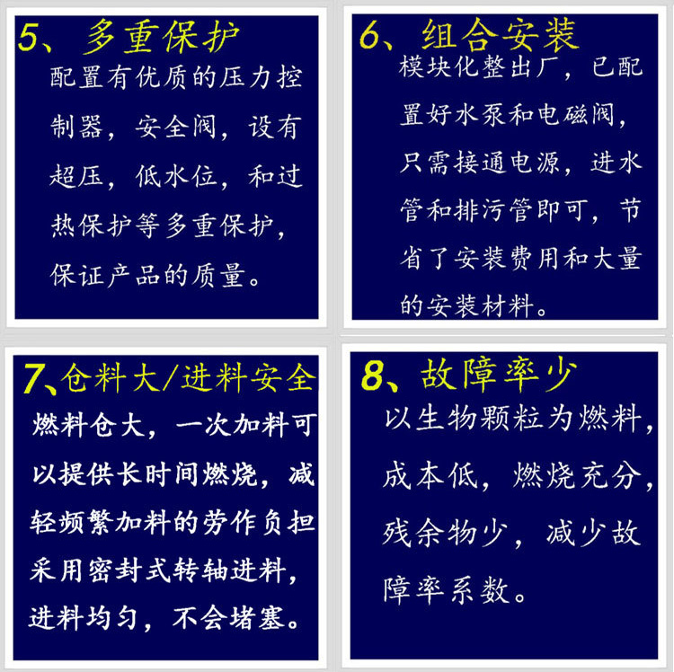 (6)組合安裝:生物質鍋爐模塊化整機出廠,水泵、電磁閥等配裝到位,只需接通電源、進水管和排污管即可,節省大量安裝費和安裝材料。