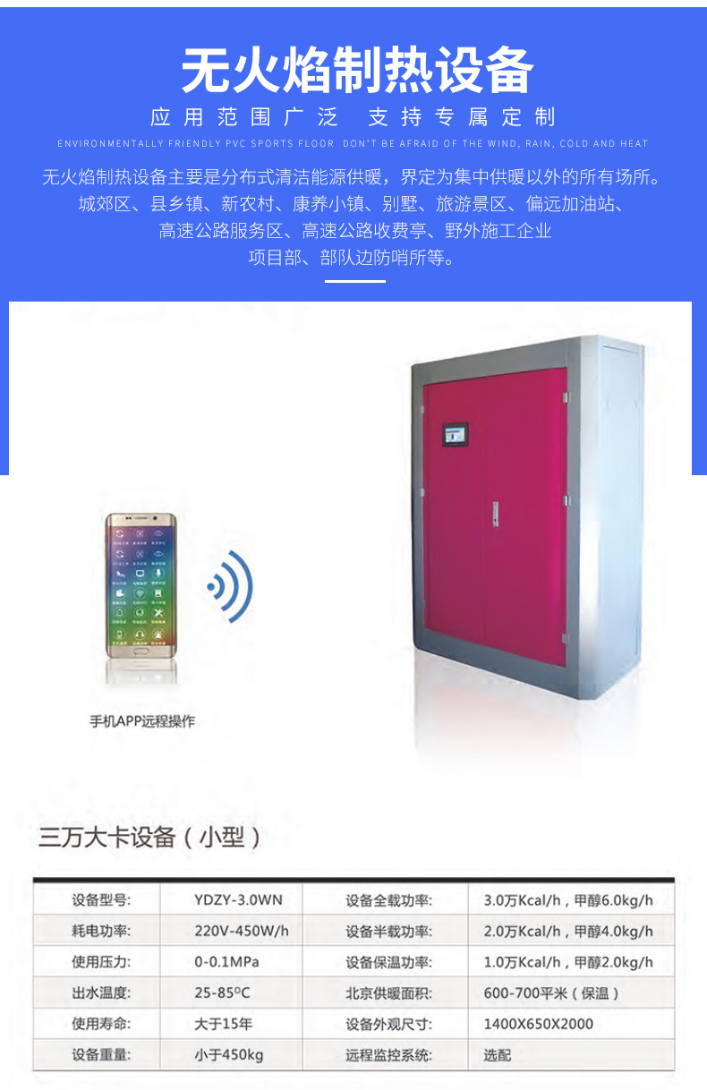 專業供應甲醇無火焰供曖設備,零污染排放,安全節能高效,是目前市場上供曖設備成本的一半,技術先進,可實現中央地曖、空調、曖片、熱水多功能一體機,適用于民宿、別墅、公寓、會所、野外工程作業。歡迎來電咨詢!可免費提供設計方案 13564883257 李小姐