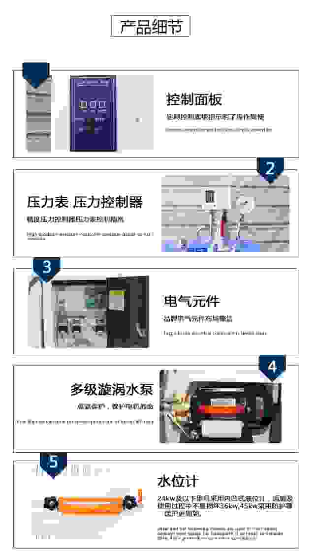 安全:自動(dòng)供水、發(fā)熱系統(tǒng)故障全自動(dòng)保護(hù),采用優(yōu)質(zhì)碳素鋼制造,經(jīng)過(guò)嚴(yán)格檢測(cè); 高效:產(chǎn)汽速度快,氣壓穩(wěn),節(jié)電節(jié)能; ??環(huán)保運(yùn)行:無(wú)噪音,無(wú)污染,熱效率高,鍋爐本體采用優(yōu)質(zhì)高效保溫材料,散熱損耗小,熱效率大于98%; 方便:體積小,安裝和移動(dòng)方便。整機(jī)質(zhì)保一年,終身免費(fèi)維修